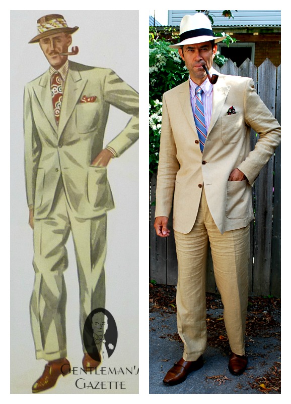 After a particularly miserable time sweating in a wool suit during a sweltering summer wedding a couple of years ago, I committed myself to getting a linen suit. That day came this summer when I ordered a two piece – admittedly very late in the season – from Walter Beauchamp Tailors. Since I had been thinking about a linen suit for so long, I had it well planned out. I had seen this illustration on the fantastic blog Gentleman’s Gazette some time ago and had put it aside.