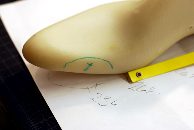 In my case, Peter checked my instep and joint measurements to determine if he needed to adjust my lasts in any way. It turns out that my right foot around the litttle toe needs to be built up slightly, which Peter will do later with leather. Otherwise, his last is a perfect match for the height of my foot.