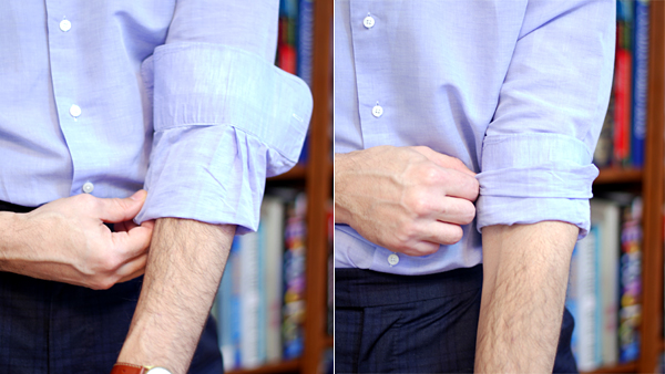 First, the “working-man’s fold” (which is what I call it while others call it the “European fold,” which I don’t understand because I’ve only encountered it in North America). You start by folding back the cuff and pulling it up your arm well past your elbow. You then take the remaining sleeve fabric from your forearm and fold it up and over the exposed cuff just past your elbow, leaving a little bit of cuff showing. This is an ideal fold for when you have some actual work to do – like washing dishes – and want to keep your sleeves clean.