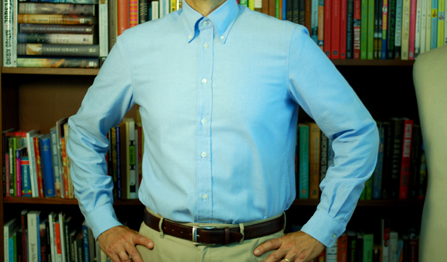 Instead, I hang all my shirts. On wooden hangers. As the blog Put This On said so well, “Don’t use wire. You’re not an animal.” Wire hangers dig into the shoulders and deform a shirt. Wooden hangers help the shirt maintain its shape as well as absorb a bit of moisture if the shirt has just been worn. And they can be found by the bundle at low prices so there’s no excuse. I like to hang my shirts back-to-back and with the top button done up, which my shirt-maker insists is unnecessary and kind of strange. I maintain that by hanging them back to back, the roll of the collar is protected, as long as your closet isn’t too full. Buttoning up the shirts serves two purposes: helping to insure they don’t slide off the hangers and – the one my shirtmaker doesn’t really believe – helps preserve the rounded shape of the collar lining.