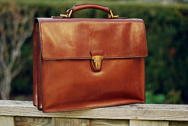 Of all the wonderful bags and accessories on display at Betty Hemmings, I kept being drawn back to The Bridge. There was something not only about their classic design but that rich, textured leather that drew me in. Michael and Alexandra were kind enough to offer me a bag for review purposes: the double gusset briefcase. It’s hard to imagine a more quintessentially classic bag. The craftsmanship is excellent, especially in the edge finishing (where the edges of the stitched-together leather are sealed with layer upon layer of sanded, buffed and burnished gum and wax) and the brass buckle, which has a remarkably solid and satisfying close. The interior of the bag is also all leather, except for two small pockets which are lined with a nice canvas.